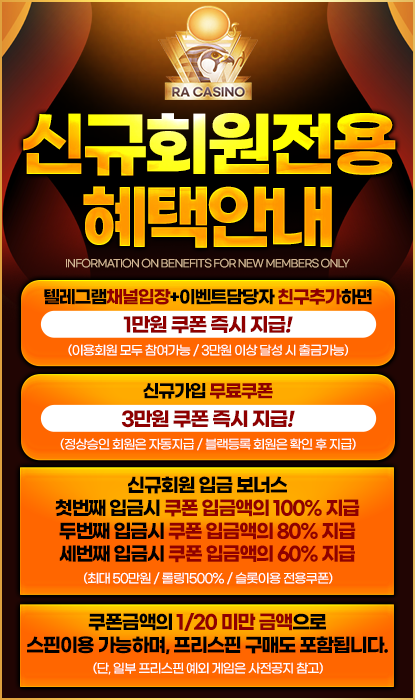 RA 카지노의 신규 회원 전용 혜택은 가입 즉시 받을 수 있는 쿠폰과 단계별 입금 보너스를 통해 초반 자금에 여유를 제공합니다. 가입만 해도 최대 4만 원 쿠폰, 입금 시 최대 150만 원 상당의 혜택을 받을 수 있으니, 첫 시작을 안정적으로 준비하고 싶은 분들에게 적합합니다.