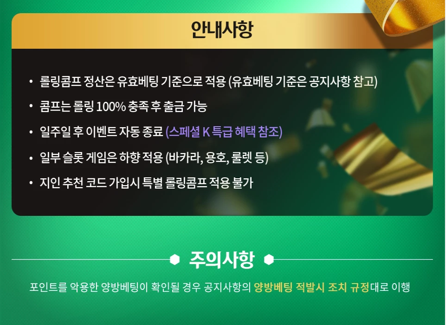 하지만 주의해야 할 점도 있습니다. 예를 들어, 추천인 코드로 가입하면 이 특별 롤링콤프 적용이 불가하다는 규정이 있죠. 또, 콤프는 반드시 100% 롤링 충족 후 출금이 가능하니, 계획 없이 무작정 베팅하다 보면 혜택을 다 못 누릴 수 있습니다. 그리고 케이카지노는 포인트를 악용한 양방배팅이 확인되면 즉시 조치한다고 명시하고 있으니, 이런 부분은 절대 건드리지 않는 게 안전합니다.