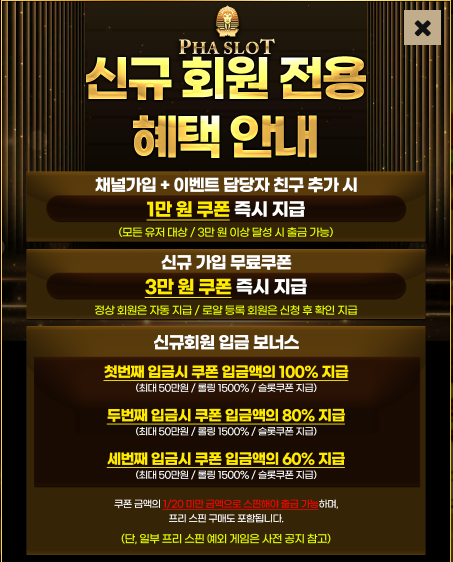 요즘 온라인 슬롯 게임을 즐기는 분들이라면 한 번쯤 신규 가입 혜택에 관심을 가져본 적이 있을 겁니다. 특히 첫 가입 시 어떤 보너스를 주느냐에 따라 게임 시작부터 차이가 나죠. 저 역시 다양한 카지노 사이트를 경험해봤지만, 이번에 알게 된 파라오슬롯 신규 회원 전용 혜택은 솔직히 혜자라는 말이 절로 나올 정도였습니다. 가입만 해도 쿠폰이 나오고, 첫 입금부터 세 번째 입금까지 단계별로 보너스를 챙길 수 있으니 시작이 아주 든든합니다. 오늘은 제가 직접 정리한 이 혜택 내용을 자세히 소개해드리겠습니다.